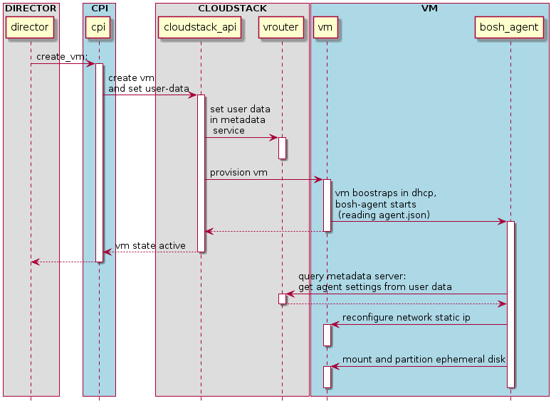 The following sequence diagram illustrates in more detail the CPI, agent, and registry interactions, in the case of the CloudStack CPI: